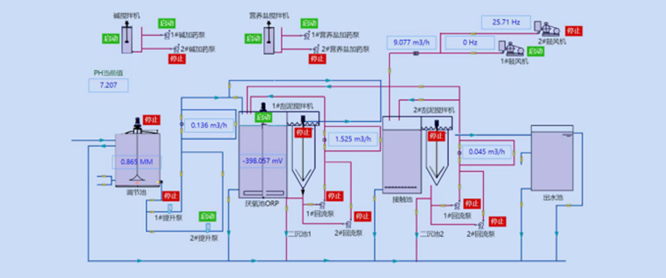 系统可采集环保生产线工艺装置的数据和状态,以组态流程图形式实时展现,也可根据需要进行控制命令的下发。